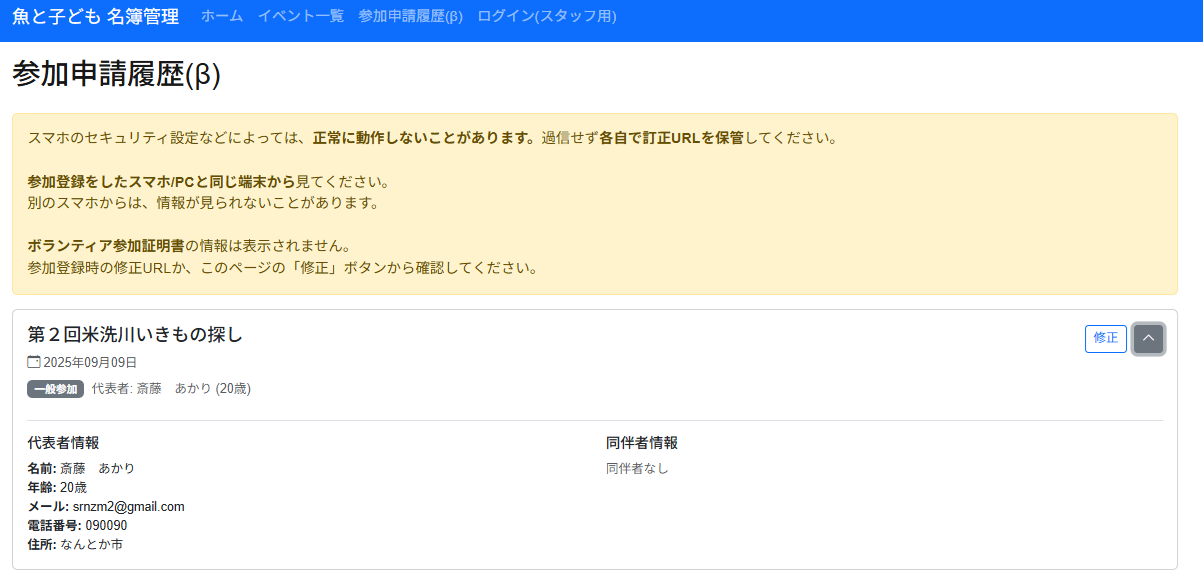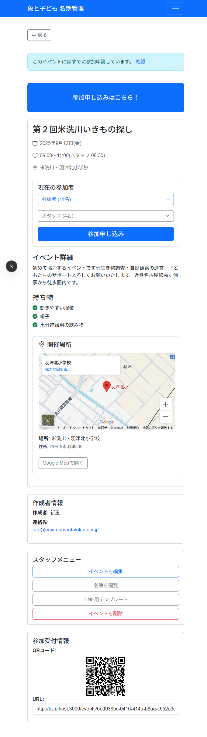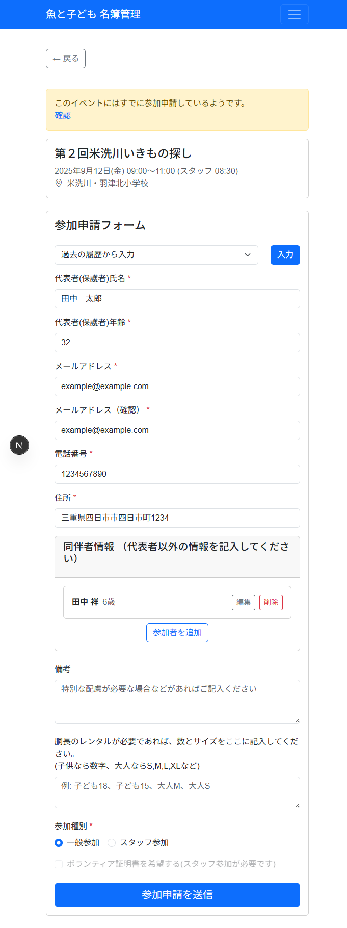 「魚と子どものネットワーク」は、子どもたちが自然や地域と関わる機会をつくるNPO(任意団体)。本導入では、イベント申込・名簿作成・証明書発行を一気通貫で支える小規模向けWebシステムを提供しました。