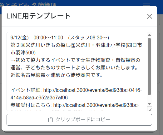 従来のイベント告知方法(LINE)に合わせて、LINE用のテンプレートや、QRコードを出力する機能を搭載。