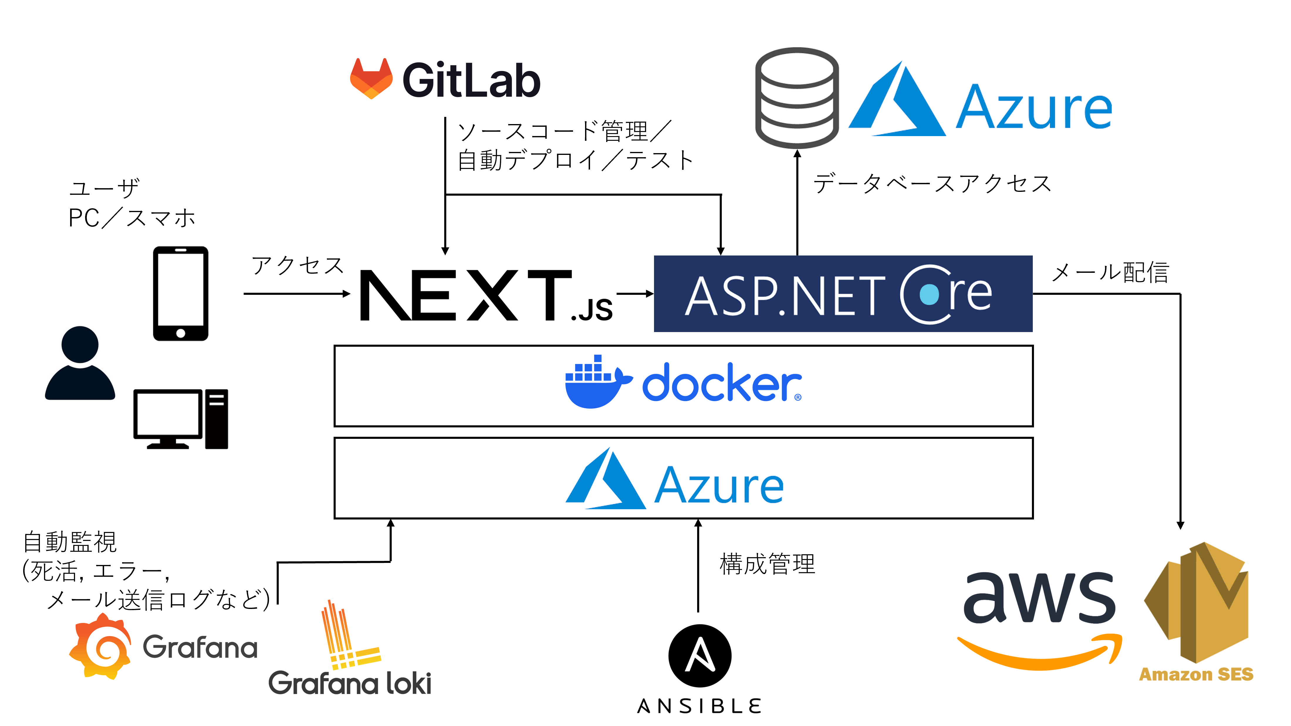 - インフラ:Azure VM + Docker Compose、GitLab CI/CD、Ansible